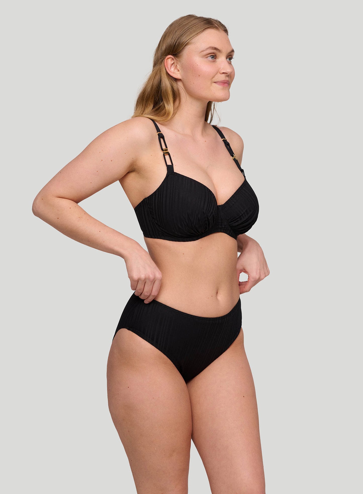PRIMADONNA SWIMWEAR Kiruna Full Bikini Brief Black is swimwear that truly has it all. Bold and chic in striking black, Kiruna is minimalist swimwear with gold accents, exuding timeless allure. A statement piece that transcends seasons, crafted from a uniquely ribbed fabric that adds depth and enhances your silhouette. These high-waisted bikini briefs boast a lustrous fabric, and comfortably cover the tummy for a flattering silhouette. Any body can find their perfect fit with the Kiruna collection.