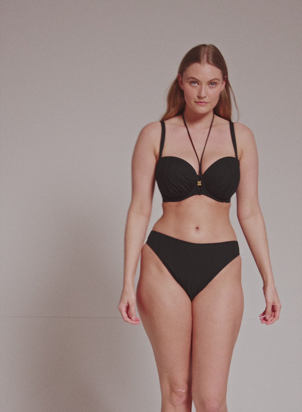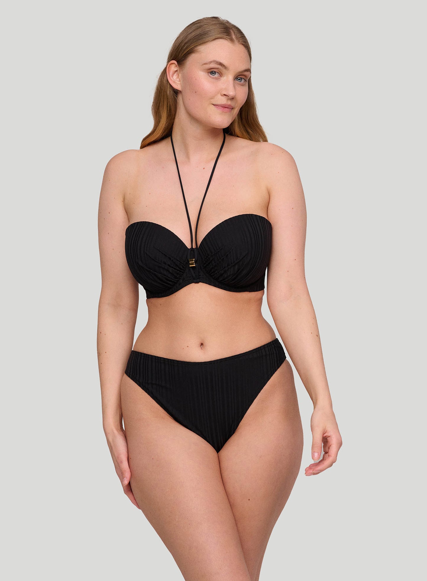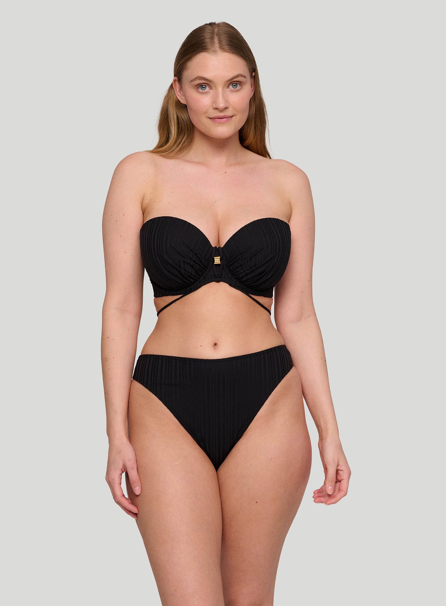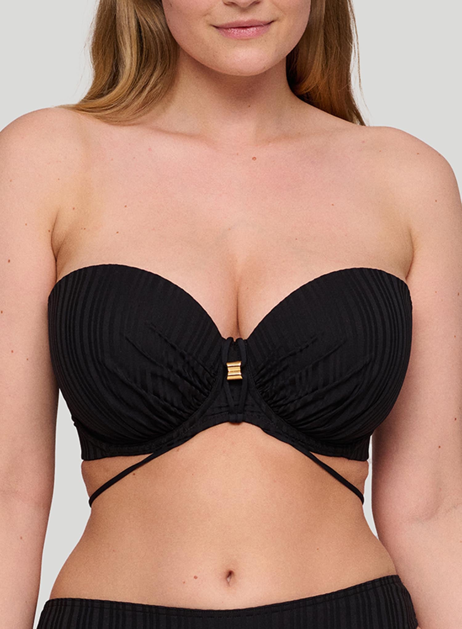 PRIMADONNA SWIMWEAR Kiruna Padded Strapless Bikini Top Black is swimwear that truly has it all. Bold and chic in striking black, Kiruna is minimalist swimwear with gold accents, exuding timeless allure. A statement piece that transcends seasons, crafted from a uniquely ribbed fabric that adds depth and enhances your silhouette. This bandeau-style top is designed to lift and support with padded cups and optional shoulder straps that can be added for extra comfort and confidence. It also features a stylish removable tie for those looking for an extra touch of allure. Any body can find their perfect fit with the Kiruna collection.