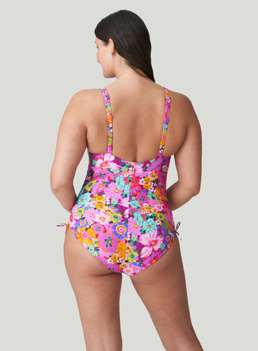 PRIMADONNA SWIMWEAR Najac Plunge One Piece in Floral Explosion brings the 60s back to life with a modern hippie look that was made for summer days and beach parties. The half-padded cup design provides firm support for the larger bust while still offering a lower cut neckline for a light, summery look. A drawstring feature at the legs allow you to adjust the height of the legs for either a sexy reveal or a more covered look. Channel peace, love and flower power this season with Najac!
