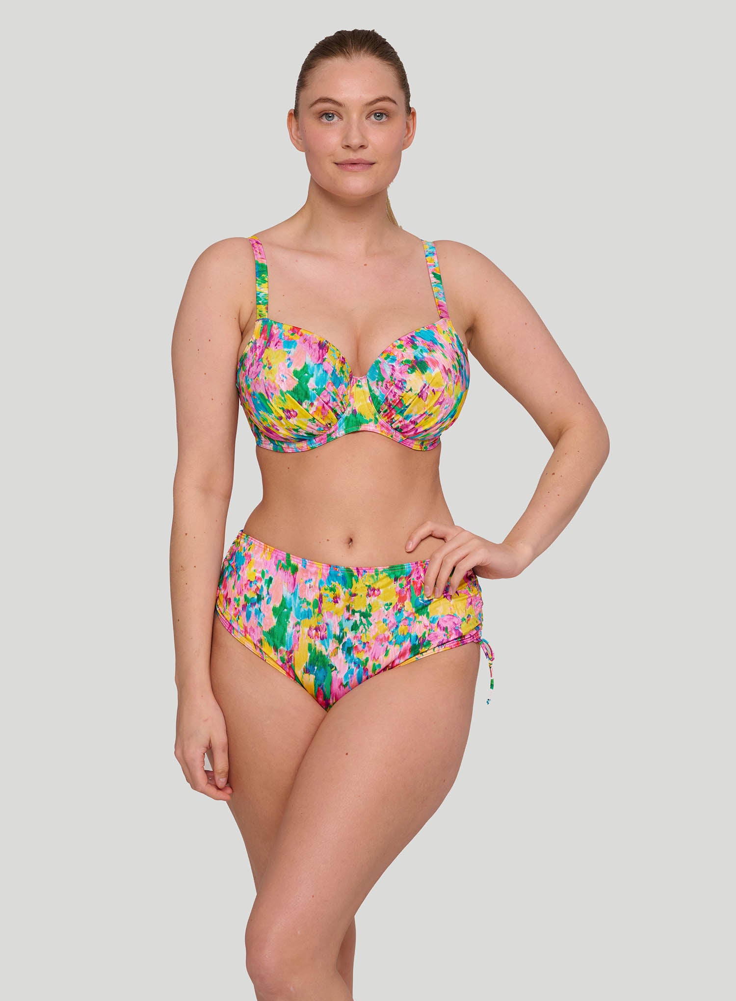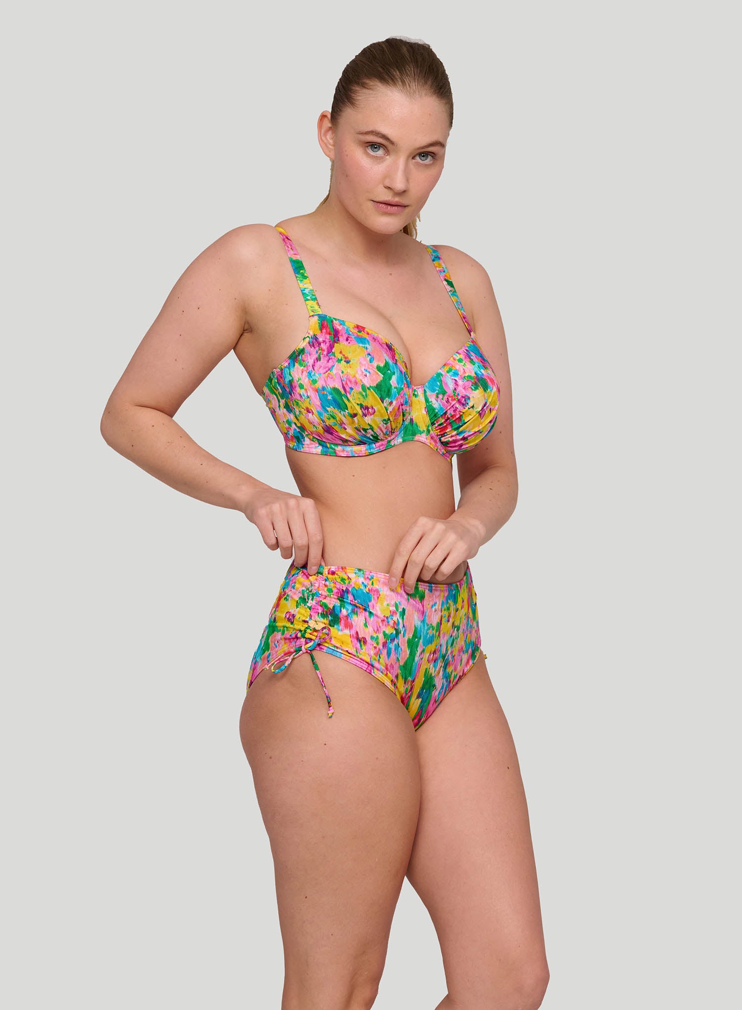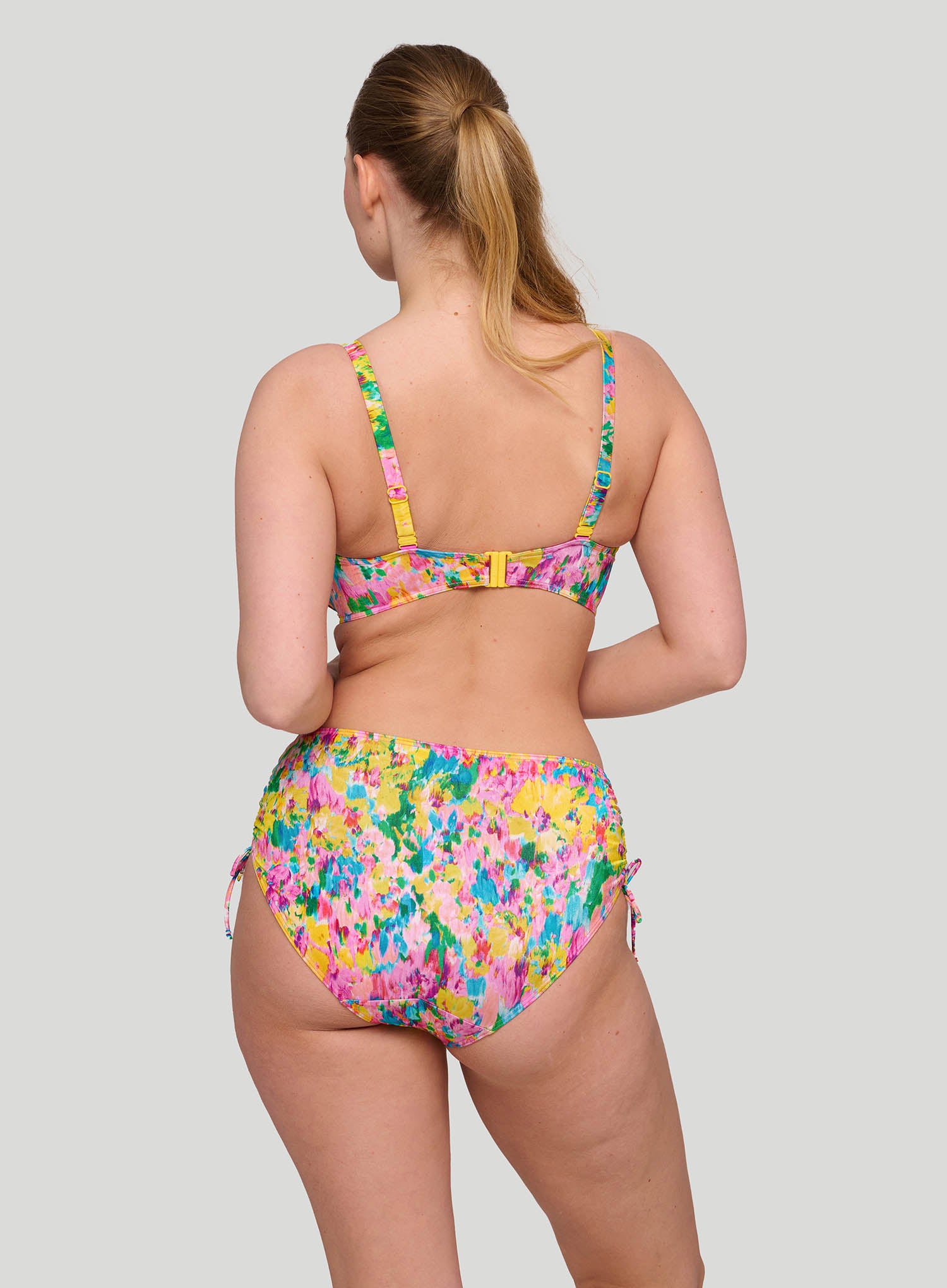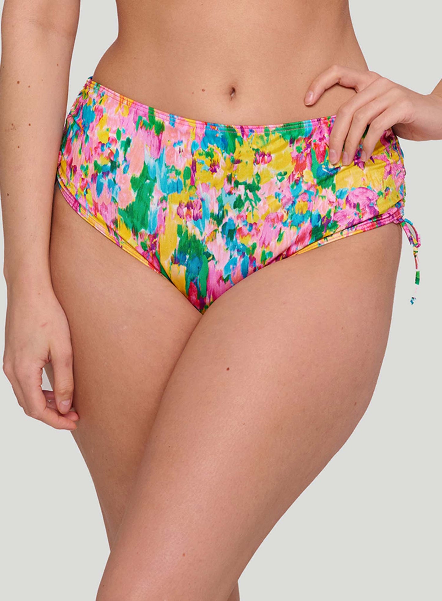PRIMADONNA SWIMWEAR Ubud Full Bikini Brief Ropes Sun Glowis a standout in this season's hero collection, showcasing a vibrant watercolor floral print in hot pink, yellow, green, and light blue for a romantic yet abstract vibe. Fans of past favorites like Najac and Kea will adore Ubud, with its pleated fabric adding a chic 3D effect and bold dimension. This painted flower design is a runway-inspired trend that’s stealing the spotlight. This high-waisted style comfortably covers your tummy, while small drawstrings features allow you to adjust the cutout at the legs for more or less coverage.