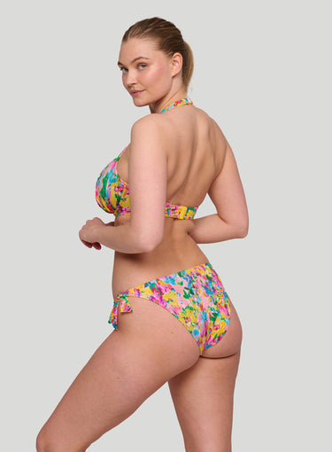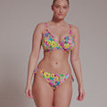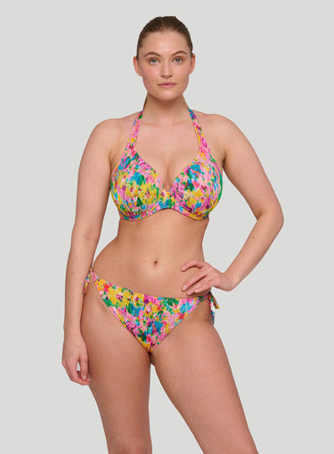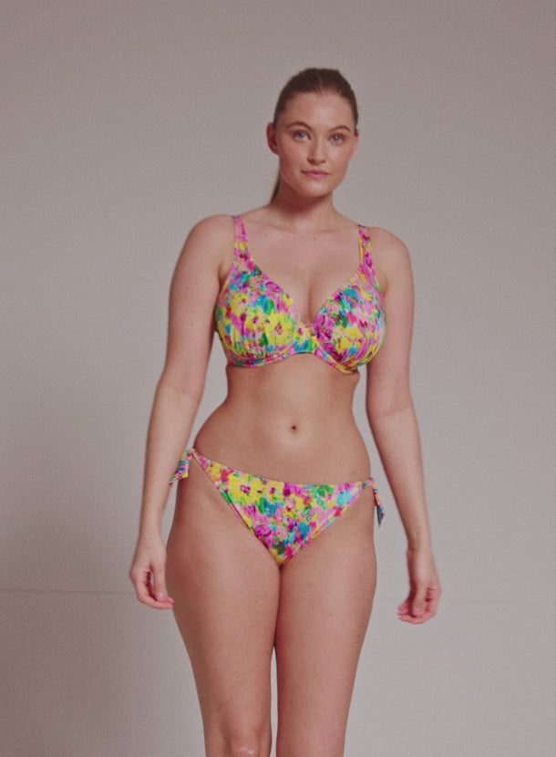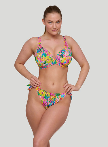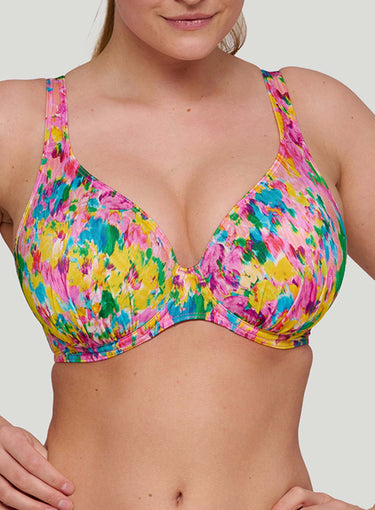 PRIMADONNA SWIMWEAR Ubud Half Padded Plunge Bikini Top Sun Glow is a standout in this season's hero collection, showcasing a vibrant watercolor floral print in hot pink, yellow, green, and light blue for a romantic yet abstract vibe. Fans of past favorites like Najac and Kea will adore Ubud, with its pleated fabric adding a chic 3D effect and bold dimension. This painted flower design is a runway-inspired trend that’s stealing the spotlight. The plunge bikini top offers comfortable lift and creates a stunning, sexy cleavage. Perfect for PrimaDonna Twist fans seeking a rounded fit in swimwear, while still offering a lower cut neckline for a light, summery look. Stand out with the style you love and the support you deserve.
