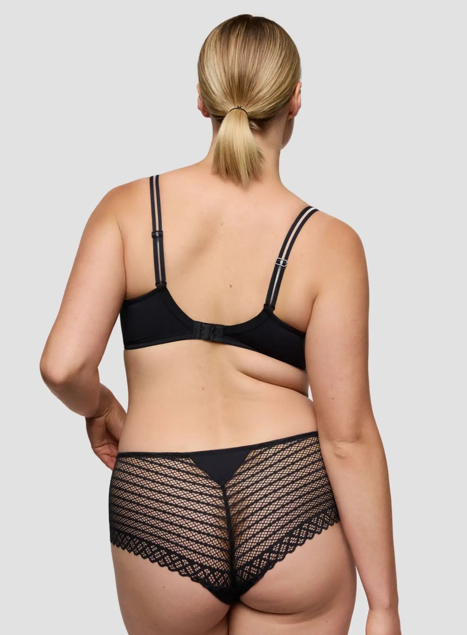 PRIMADONNA TWIST Twist Side Underwired Full Cup Bra in Charcoal is a sleek, elegant T-shirt bra with a minimalist yet striking design. The smooth microfibre base is complemented by geometric stretch lace for subtle glamour, while full coverage cups and a cushioned underwire provide comfortable lift and support. Adjustable straps can be styled traditionally or crossed for versatility. Softer than classic black, this shade feels sophisticated and wearable, making it perfect for everyday elegance.