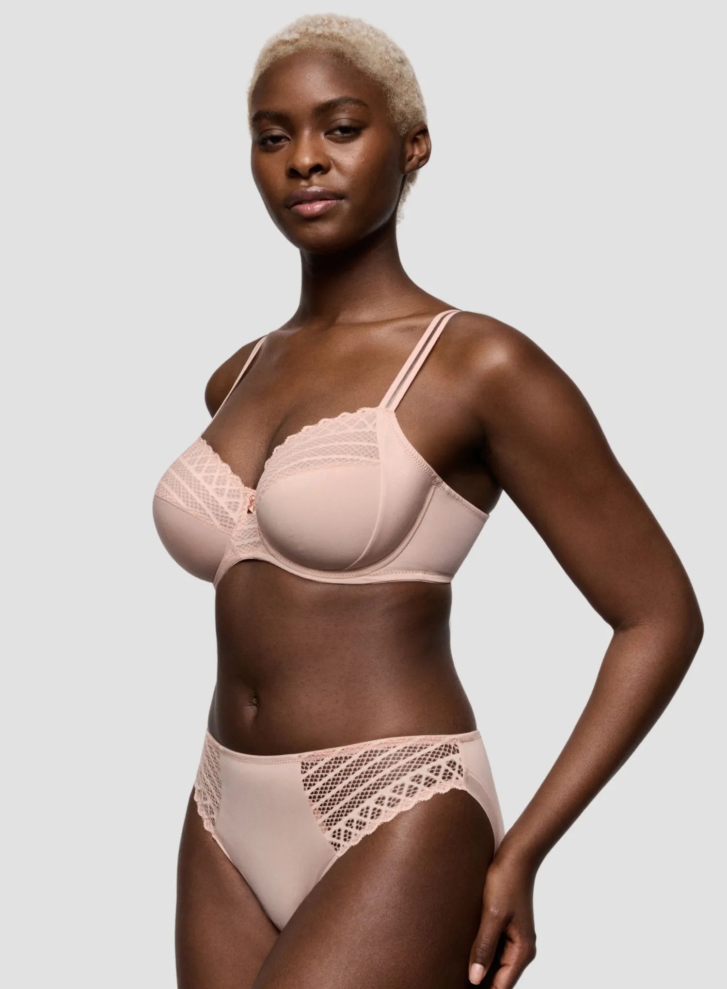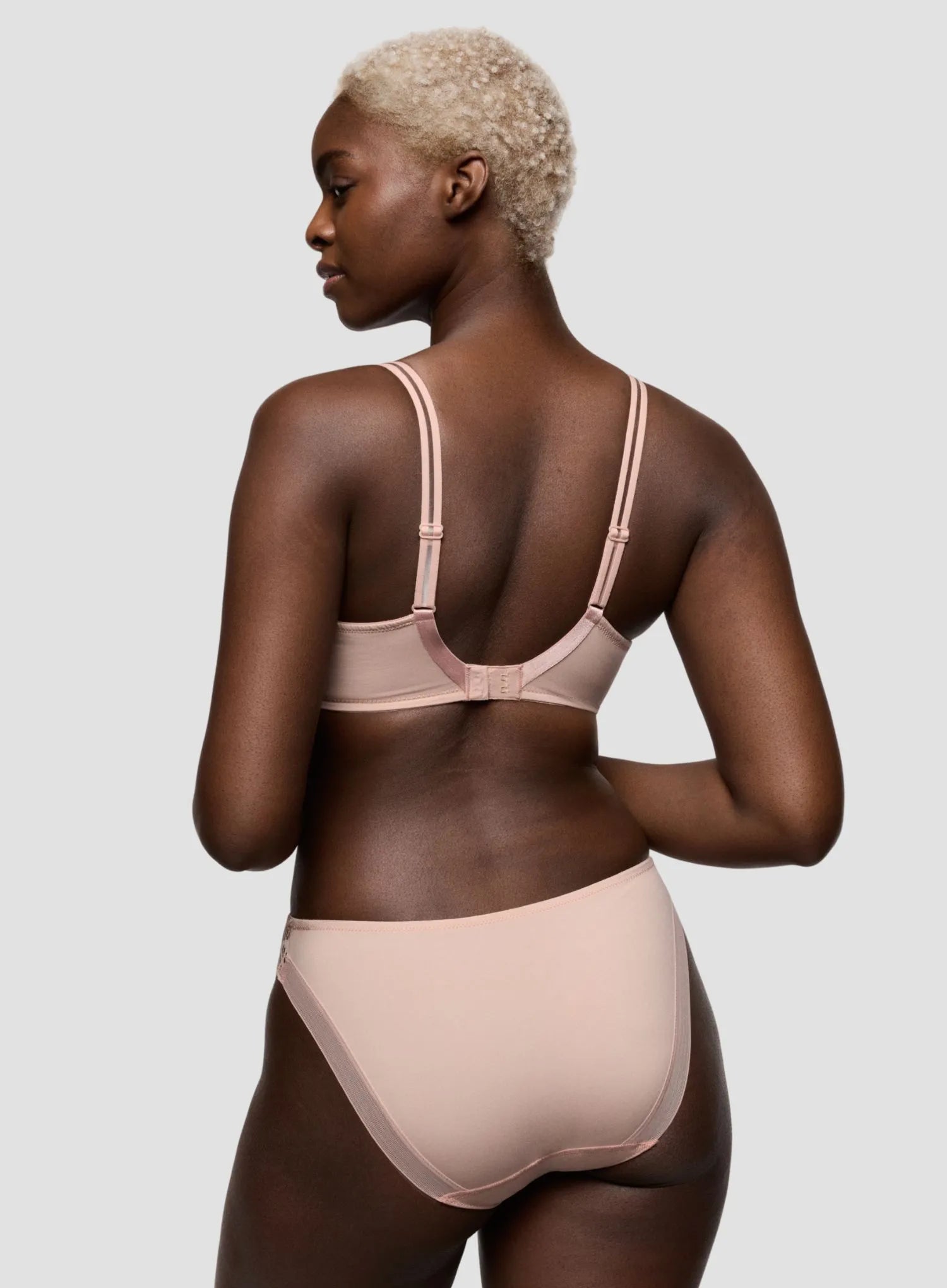 PRIMADONNA TWIST Twist Side Underwired Full Cup Bra in Powder Rose is a sleek, elegant T-shirt bra with a minimalist yet striking design. The smooth microfibre base is complemented by geometric stretch lace for subtle glamour, while full coverage cups and a cushioned underwire provide comfortable lift and support. Adjustable straps can be styled traditionally or crossed for versatility. The soft, warm Powder Rose shade is sophisticated and wearable, perfect for everyday elegance.