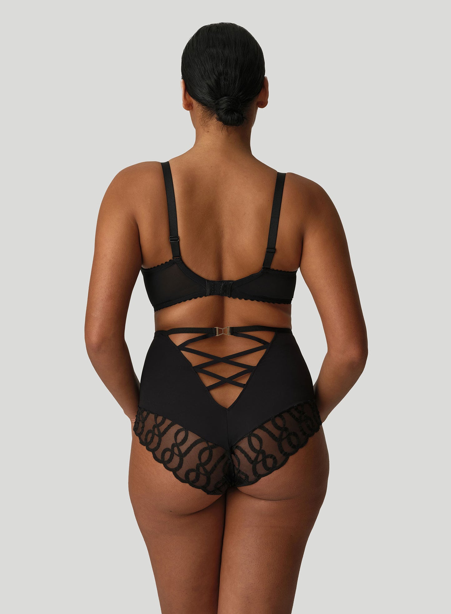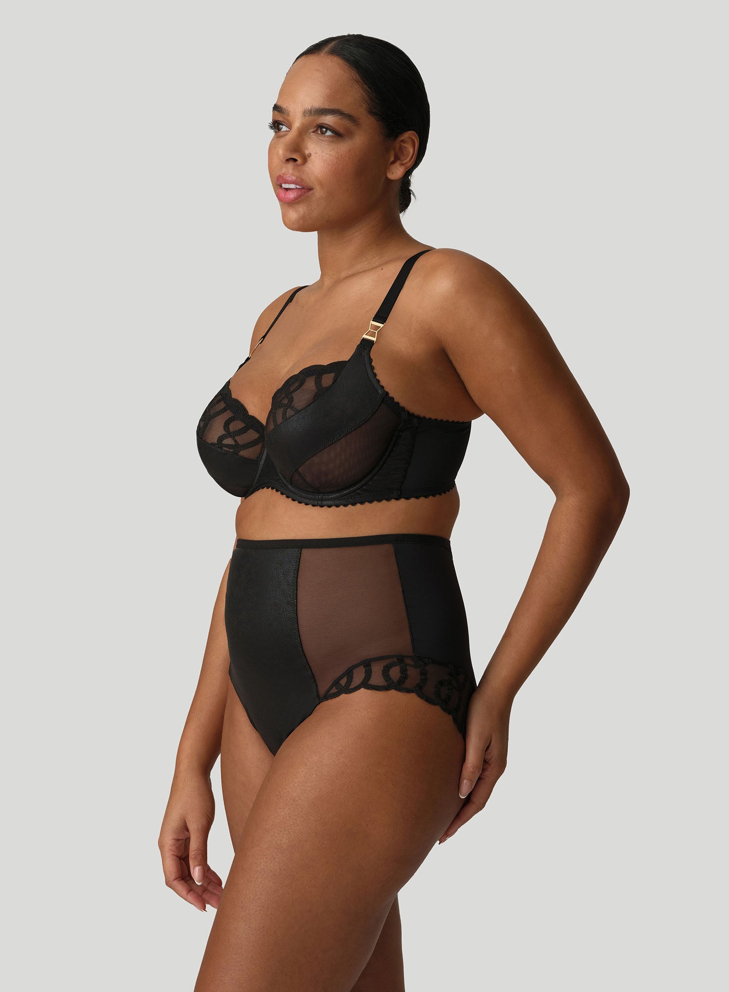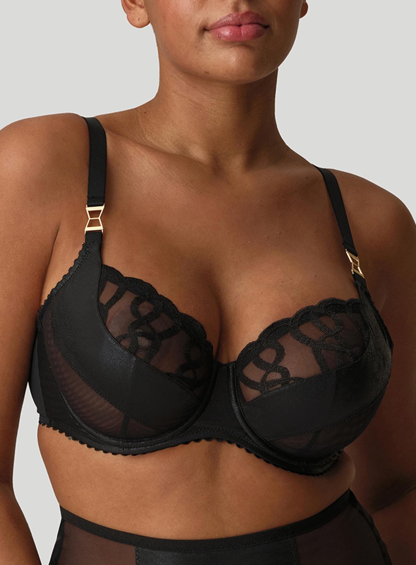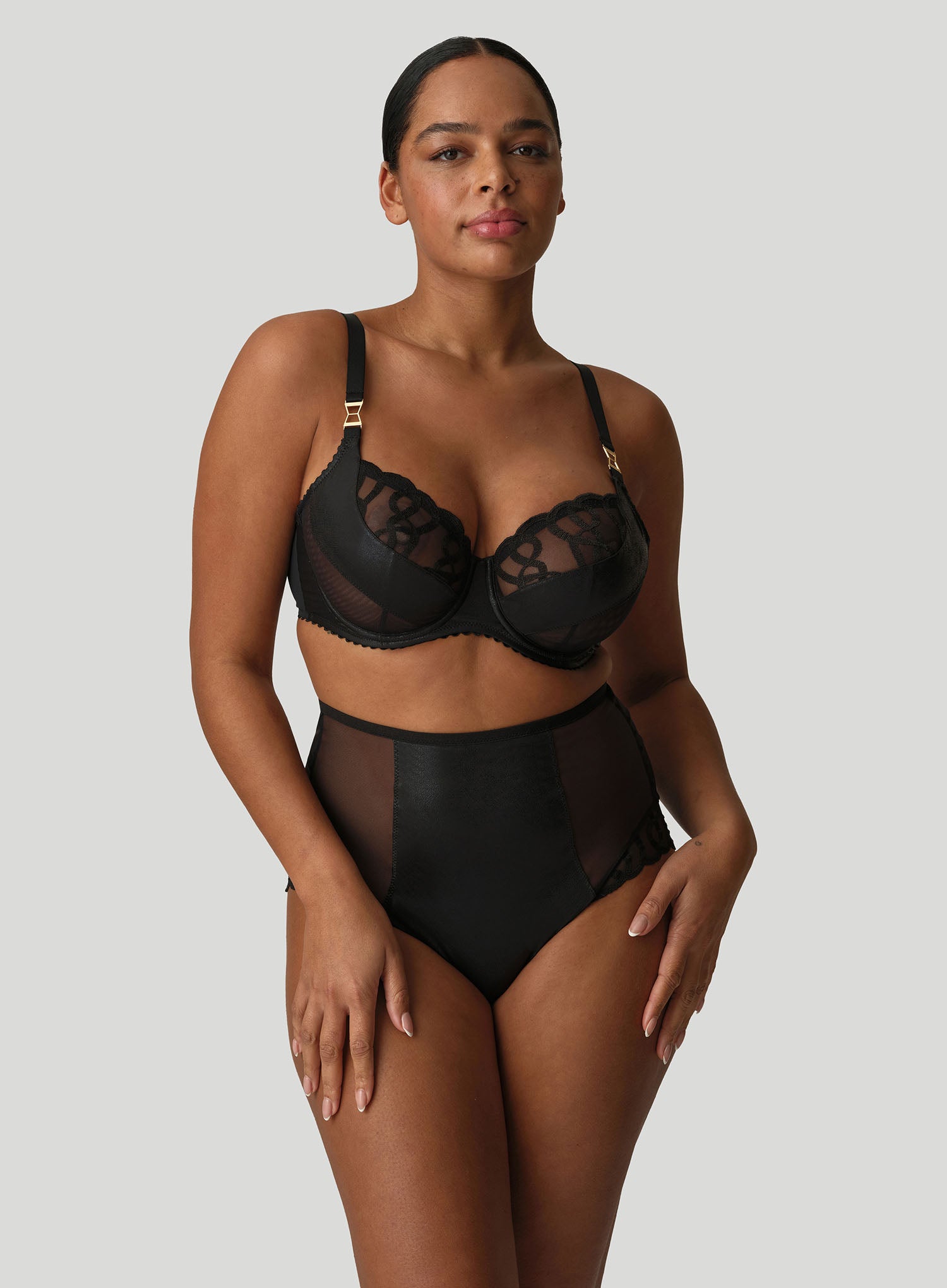 PRIMADONNA Vallarta Tulip Seam Balconette Bra Black is lovingly inspired by the popular Arthill series, featuring a cool, sexy twist. This design combines delicate mesh fabric with sexy faux leather and shimmery French embroidery for the ultimate ‘It Girl’ look. A balcony bra in a tulip cut with a low neckline, the bottom sections of the cups are double lined in sturdy tulle for uplift and support. This design from PrimaDonna seamlessly blends the latest fashion trends with impeccable lingerie fit. Vallarta embodies sheer seduction while offering robust support for larger cup sizes. This is power lingerie at its peak!