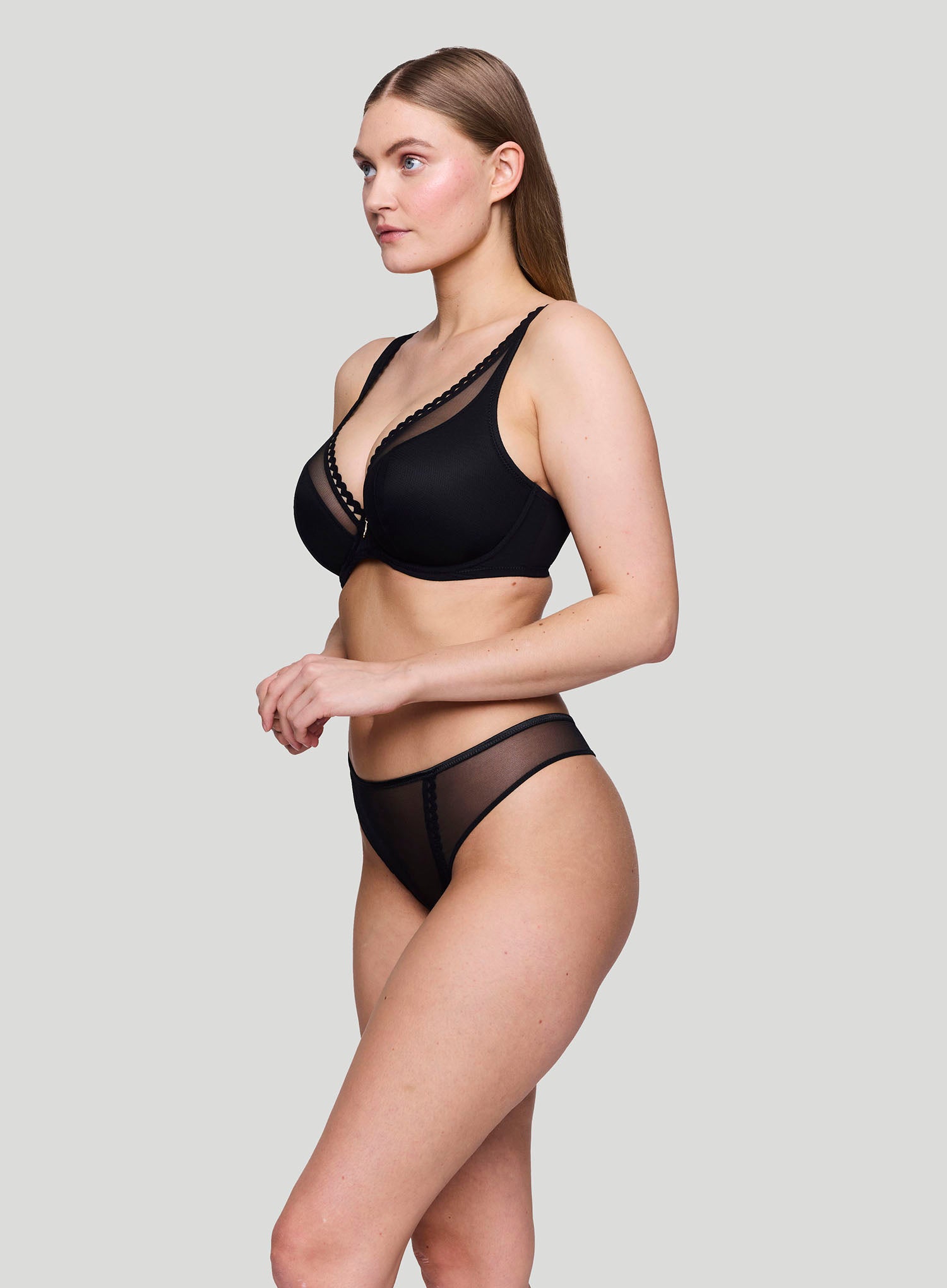 PRIMADONNA TWIST Vivgirl Thong Black blends seductive minimalism with ultimate comfort, creating a sleek and stylish silhouette. This design blends delicate mesh fabric with charming scalloped details for the ultimate ‘It Girl’ aesthetic. The thong features a high-cut leg, leaving the back fully exposed for a flirty, seductive touch. Timeless black enhances the sensual, sheer look, making this set effortlessly bold and alluring.