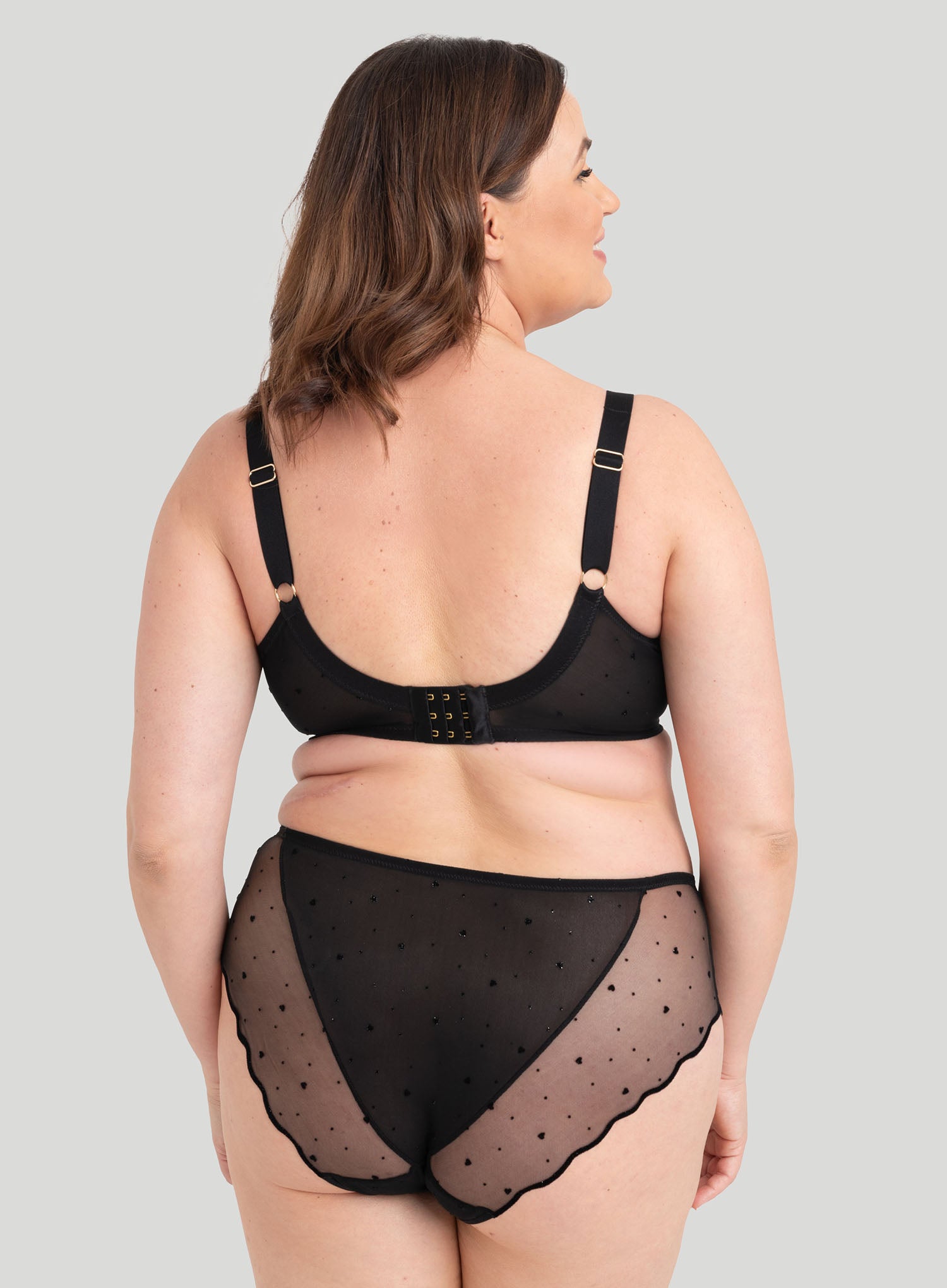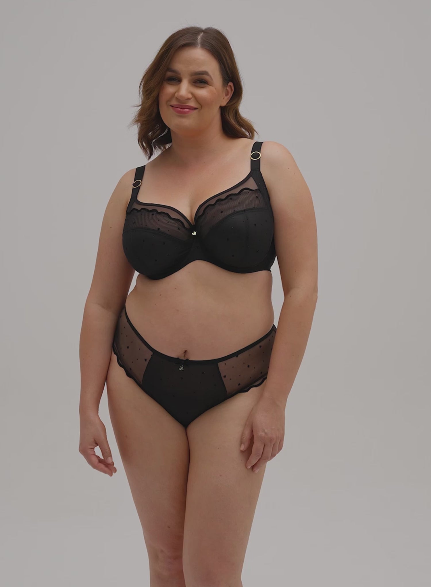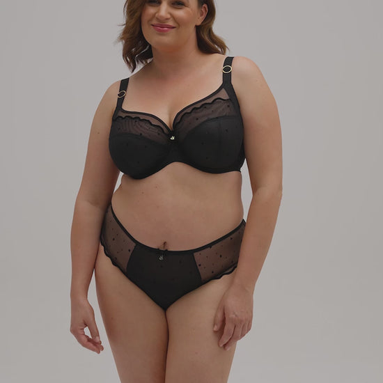 SAMANTA LINGERIE Melania Midi Brief Black, a stunning blend of elegance and comfort. Crafted from Italian flocked lace adorned with delicate heart motifs, its rich midnight hue exudes sensuality. The shimmering accents in the lace are soft to the touch and gentle on the skin, ensuring all-day comfort. Designed for a flattering fit, the brief features lightweight yet supportive tulle and flocked lace panels that provide both style and ease. Perfect for romantic evenings or whenever you want to feel effortlessly elegant, this piece is a captivating addition to your lingerie collection.
