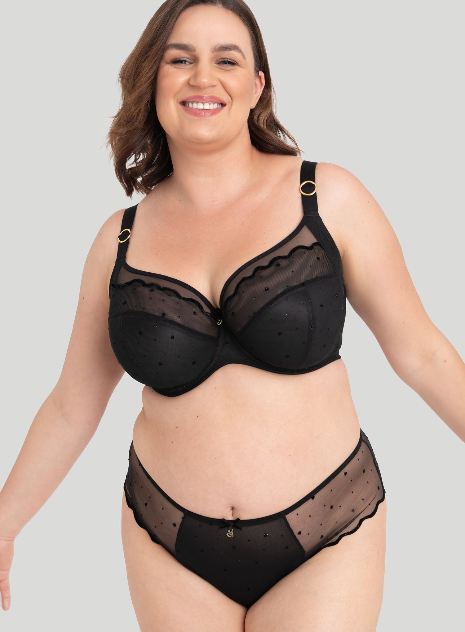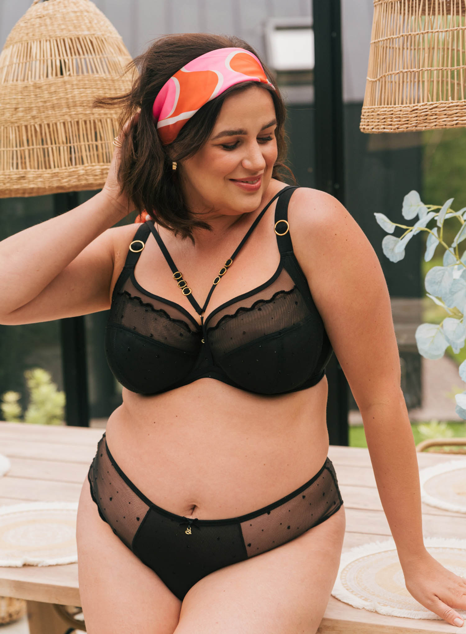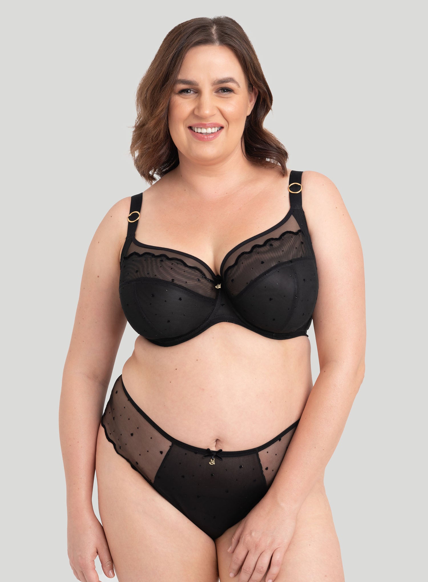 SAMANTA LINGERIE Melania Midi Brief Black, a stunning blend of elegance and comfort. Crafted from Italian flocked lace adorned with delicate heart motifs, its rich midnight hue exudes sensuality. The shimmering accents in the lace are soft to the touch and gentle on the skin, ensuring all-day comfort. Designed for a flattering fit, the brief features lightweight yet supportive tulle and flocked lace panels that provide both style and ease. Perfect for romantic evenings or whenever you want to feel effortlessly elegant, this piece is a captivating addition to your lingerie collection.