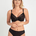 SAMANTA Mija Soft Balcony Bra brings the sexy back in black. It is no secret that colours affect our well-being, and when properly selected, they can evoke a feeling of peace, relaxation, and motivation. Mija is made of Austrian lace with a geometric pattern. DeBra’s Fitting Consultants found Samanta Lingerie to bring a fashion-forward approach to conventional lingerie while maintaining fit.