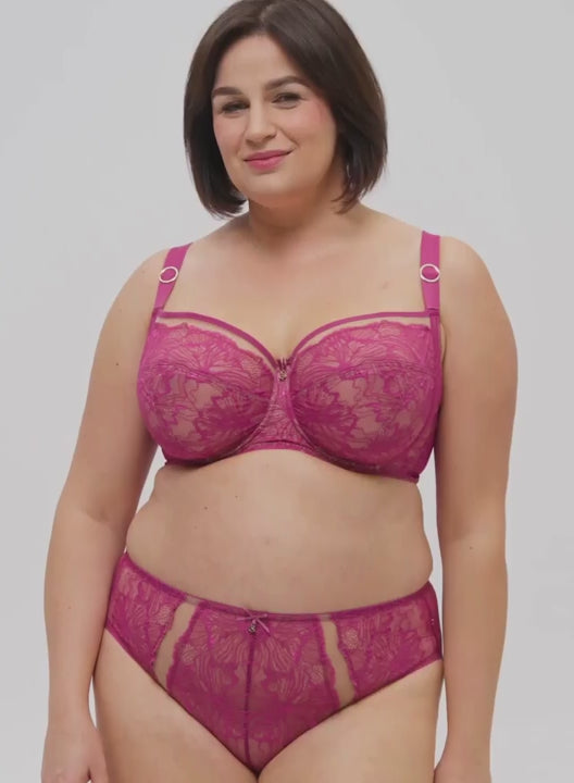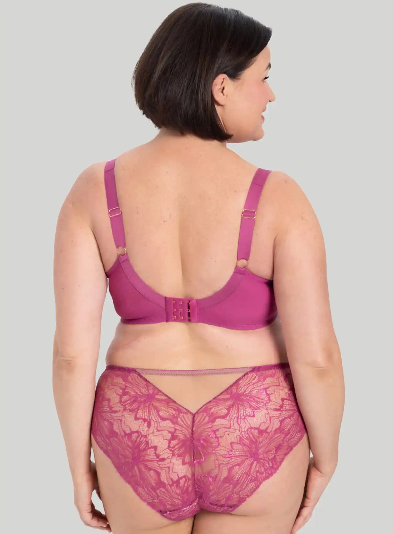 SAMANTA LINGERIE Mila Midi Brief in Raspberry is where romantic design meets everyday elegance. Crafted from delicate Italian lace in a cornflower motif, this flattering mid-rise style features sheer mesh panelling at the front and intricate lacework across the back, beautifully framing your curves while offering light coverage.