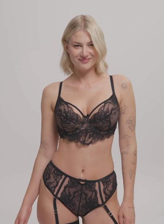 SAMANTA Mystery Soft Balcony Bra in Black combines timeless elegance with a sensual, tattoo-inspired lace design that feels like a second skin. The longline balconette shape lifts and shapes naturally, while delicate lace extends over the underbust for a flattering silhouette. Adjustable straps ensure a personalised fit, and high-quality Italian lace paired with decorative knit provides stable support without compromising comfort.