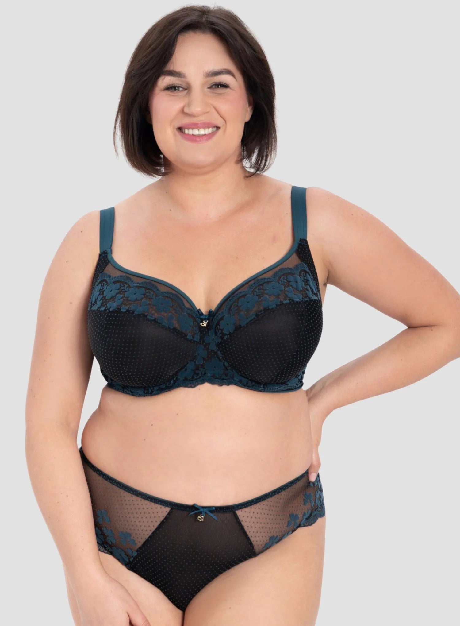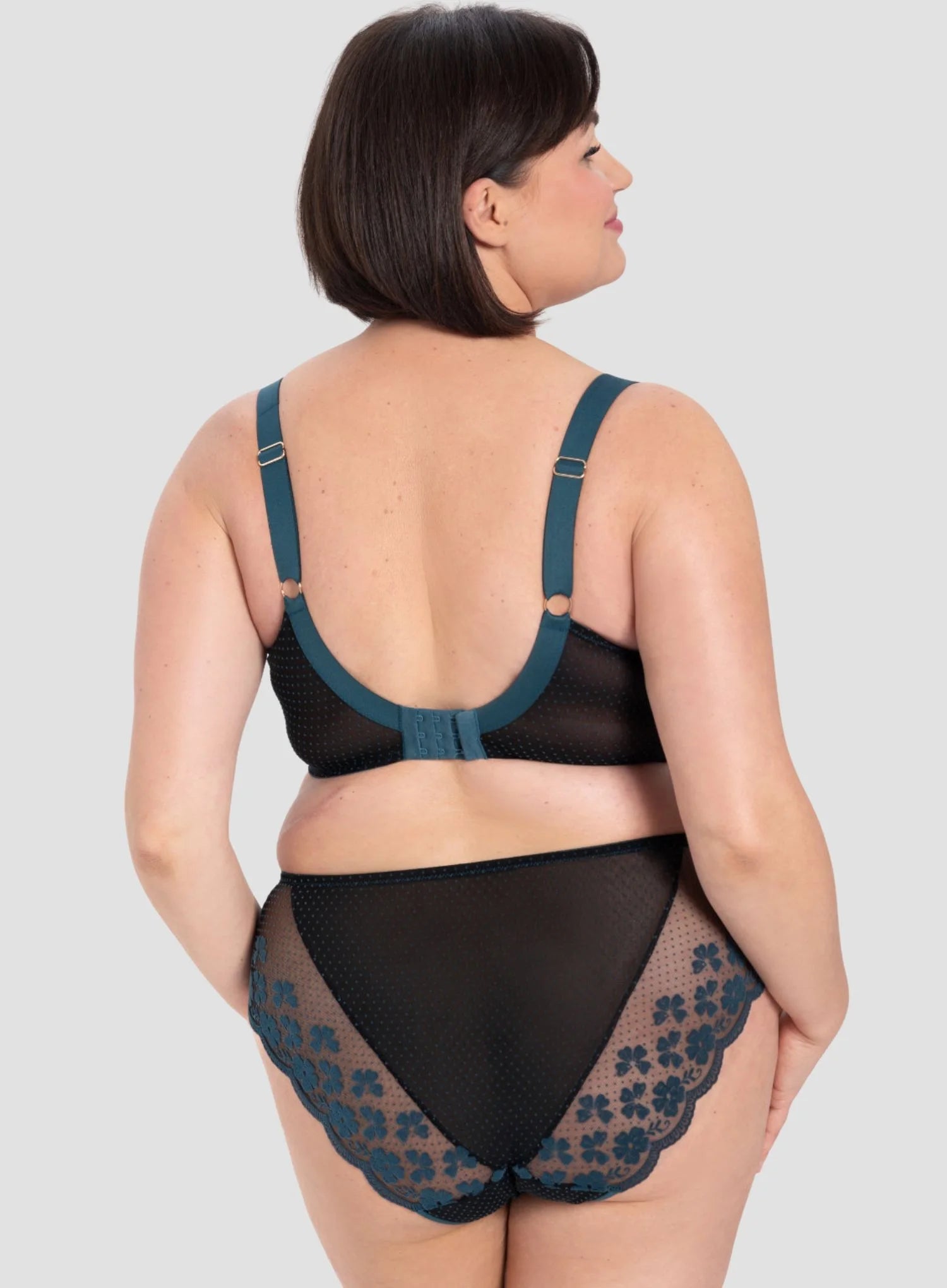 SAMANTA LINGERIE Scarlett Thong in Azure offers a playful, cheeky Brazilian-inspired cut that enhances your curves while remaining soft and comfortable against the skin. The wrap-around Italian flocked lace in teal, set over subtly sheer black tulle, adds a delicate, feminine touch that elevates this everyday essential.