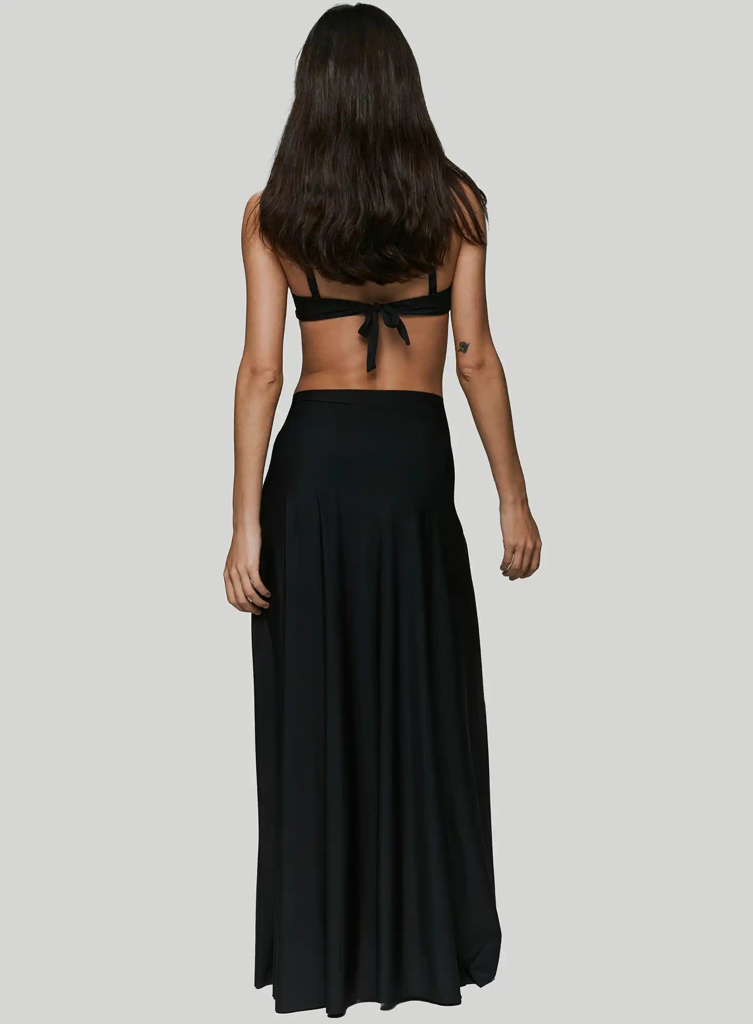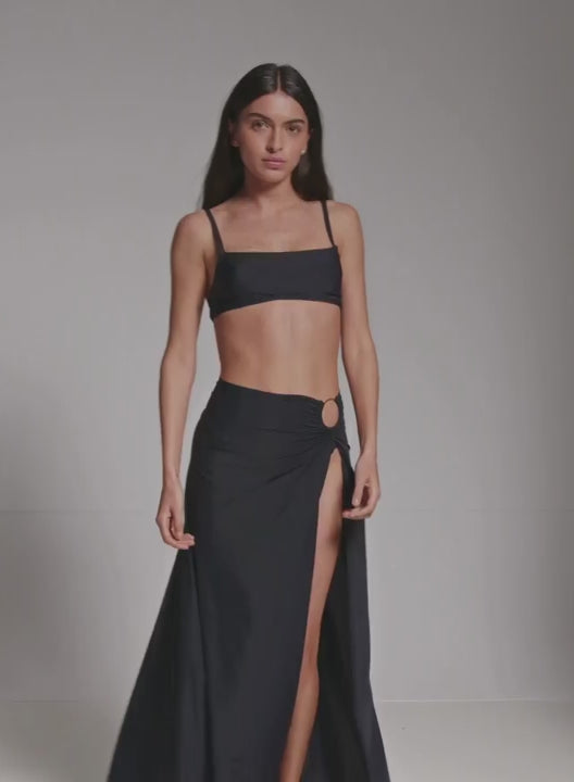SARDA Lita Sarong in Black is the definition of effortless resort dressing, offering two luxe looks in one versatile piece. Whether worn as a halter-style dress or tied low on the hips as a wrap skirt, the Lita Sarong delivers instant glamour with its soft, clean-cut fabric and signature oversized gold ring detail.