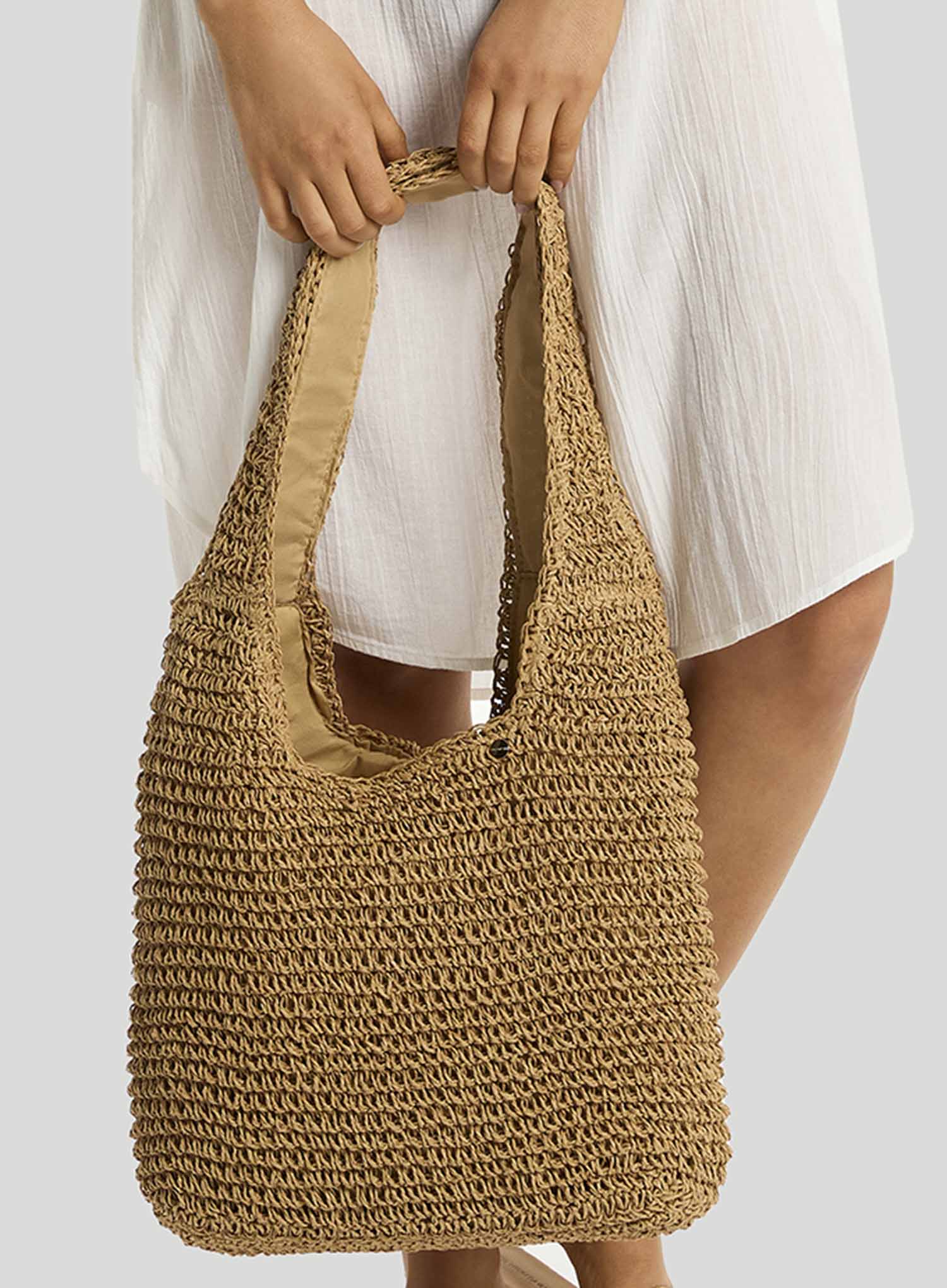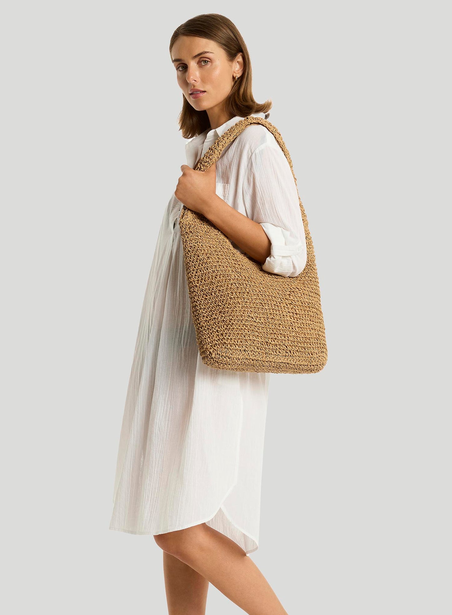 SEA LEVEL Crochet Slouch Beach Bag Caramel blends effortless style with practicality, making it the perfect addition to your summer rotation. Crafted from a mix of recycled fabrics, canvas, and paper raffia, this eco-conscious tote brings a relaxed, textured look that complements any swim or resort wear look.