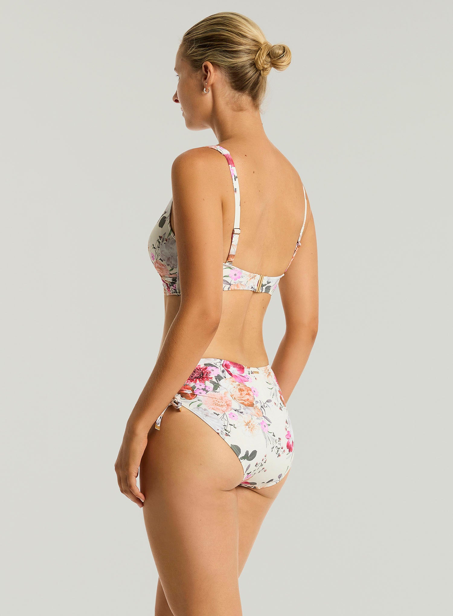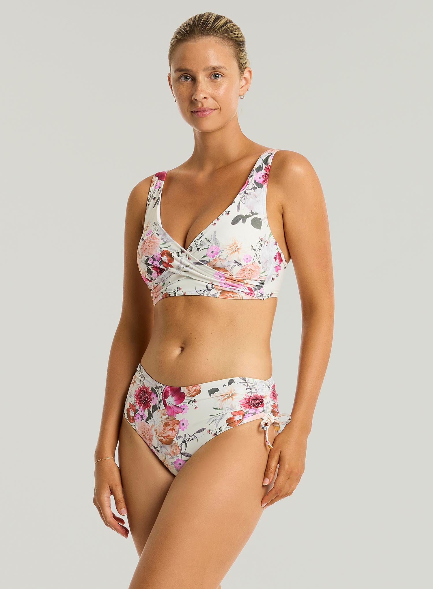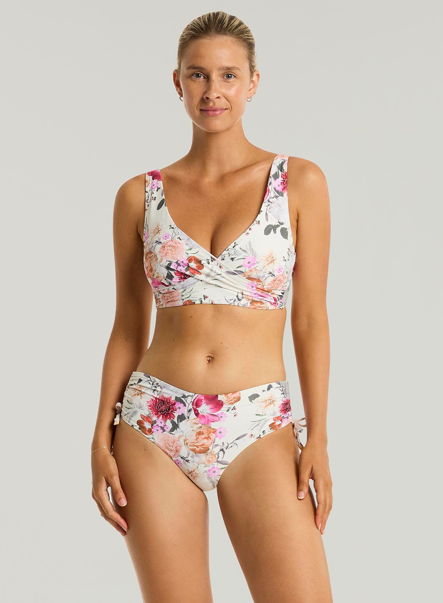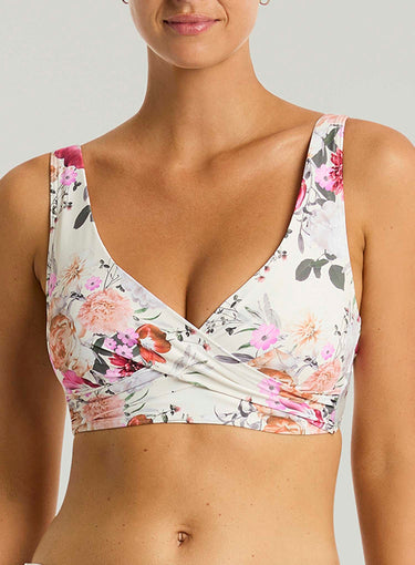 SEA LEVEL Belle Cross Front Multifit Bikini Top Coconut brings to mind the feeling of a walk-through blooming fields and the joy of nature, captured in a soft watercolor palette. Showcasing charming a floral design, this collection blends folkloric appeal with sleek, athletic lines. Effortlessly stylish and completely sustainable, this entire collection features a luxurious look and feel on the skin. This wirefree design is the ultimate in comfort, featuring fixed soft cups and an elasticated band which provides all the necessary support for a small to medium bust size. Look and feel your best all summer long.