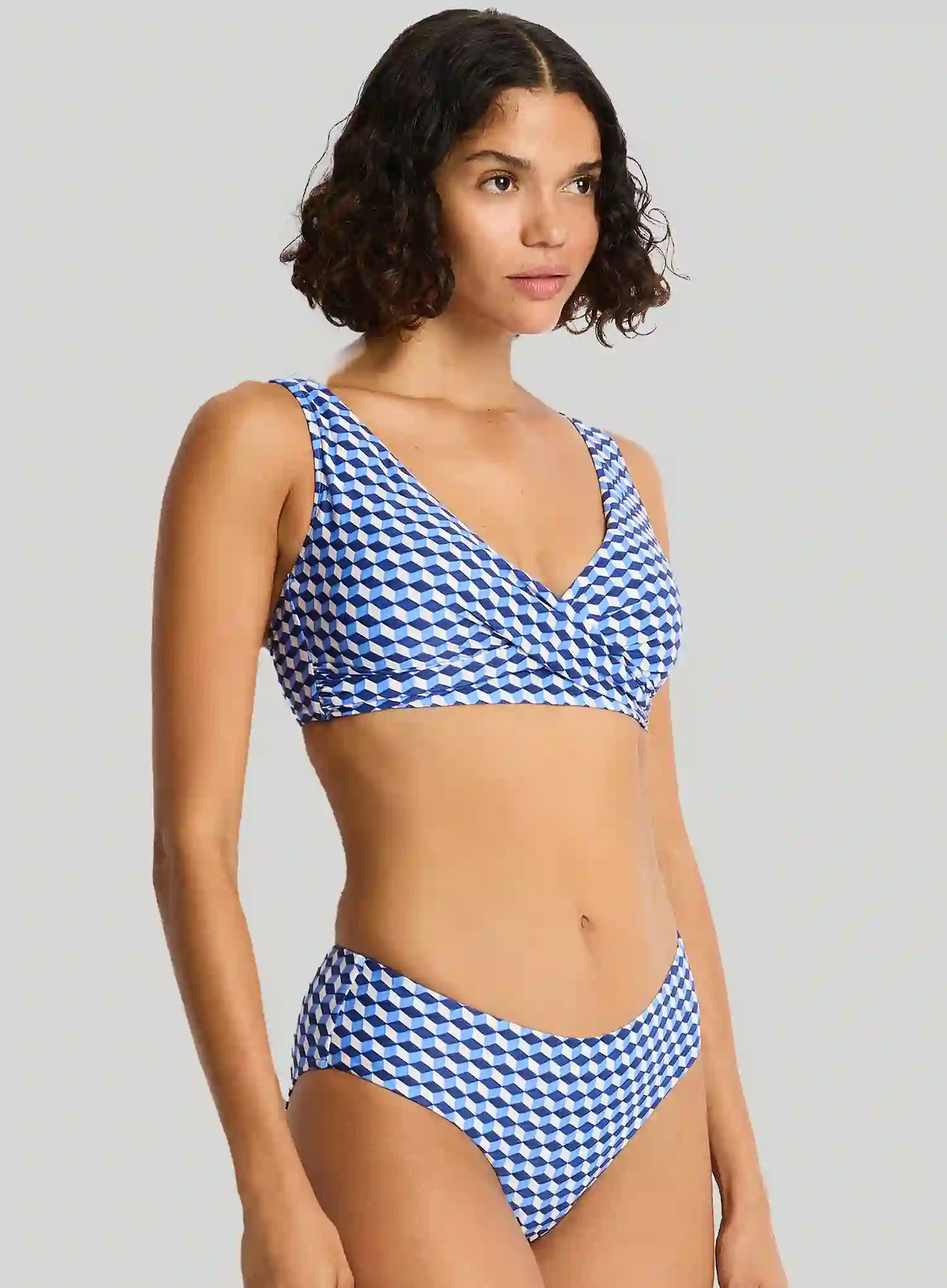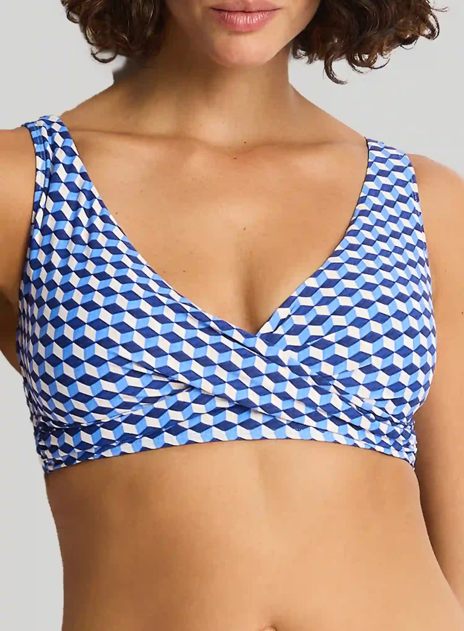 SEA LEVEL Solara Cross Front Multifit Bra Top Blue is a timeless, wirefree bikini top that blends effortless styling with sculpting comfort. Set in a vibrant Amalfi-inspired tile print, it features a cross-front neckline that flatters without bulk, with elegant gold tones woven throughout the marine palette.