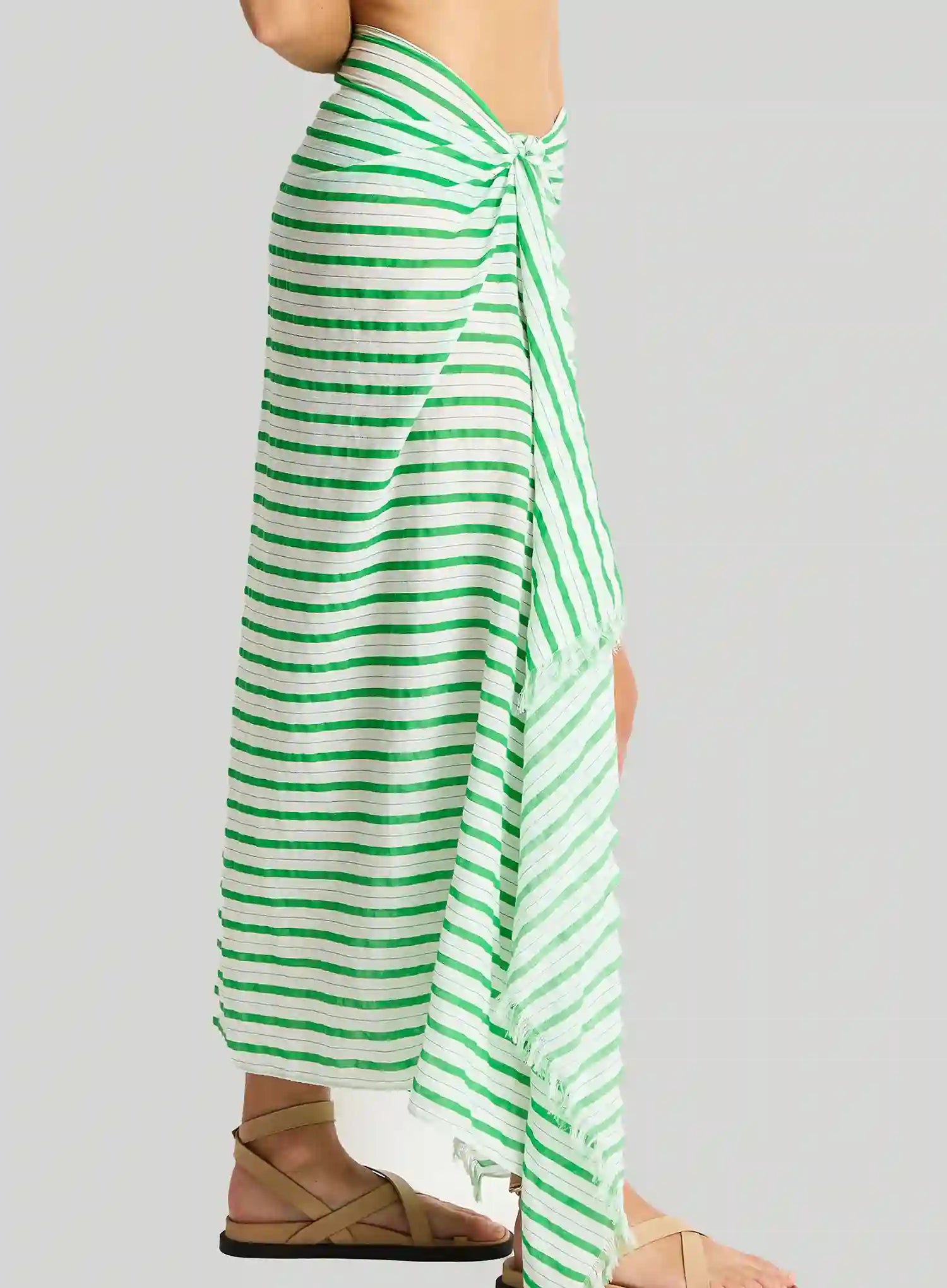 SEA LEVEL Vacay Long Sarong Kelly Green is the ultimate travel essential—easy, effortless, and endlessly versatile. In a classic white-and-green stripe, it’s designed to pair perfectly with the bold tones of our Kelly Green swimwear collection, while still working beautifully with neutral or block colours.